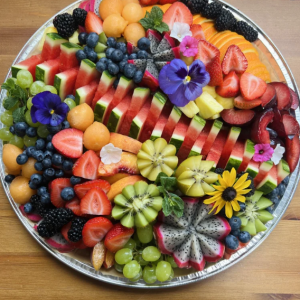 An eye-catching assortment of ripe, seasonal fruit—arranged with care and accented with fresh mint and edible blooms (when in season). Perfect for brunches, showers, or as a colourful complement to any grazing table.